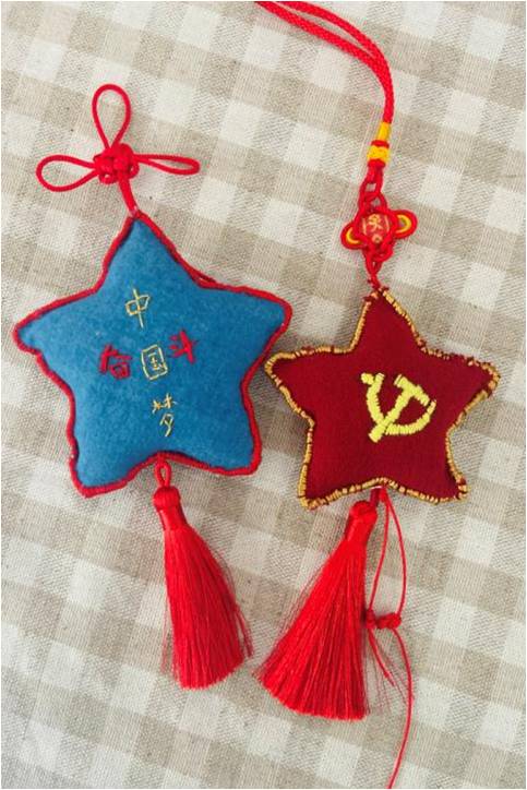 印中国心是老年大学洪塘分校手工班的学员们正在老师的指导下缝制中国心手作,党徽镶嵌在中国心里,寓意党和人民一条心,共同谱写中国梦!还有老师亲手缝制的“不忘初心·清莲”手作,“清莲”音同“清廉”,表达了党员清廉自律的高洁品质。