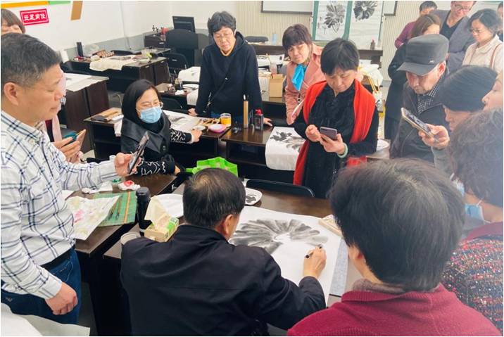 那么用水墨描绘荷花图的书画班的学员们也在课上,跟着老师一起演绎水墨荷花的美好,学员们担心错过老师精彩演讲,还现场拍起了视频,回家慢慢研究。虽然对一些年纪大的学员来说控笔有一顶难度,但为了描绘出一幅精致的作品献给党,他们愿意一遍一遍反复在宣纸上练习,直到自己满意为止。