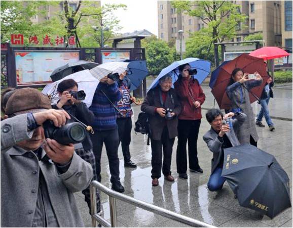 冒雨去户外采风的是摄影班的学员们,恰逢四月一直阴雨绵绵,每次上课都等不来晴好天的学员们索性顶着伞背着相机就出发了,走进社区“咔嚓咔嚓”不停捕捉着和美社区建设的点点滴滴,以前垃圾乱扔的场景不见了,取而代之的是整齐的垃圾分类小屋,还有桶边督导在引导居民如何垃圾分类。图中一位头发花白的奶奶年近80岁,听力已经慢慢退化了,但是她宁愿戴着助听器,也要和大家一起外出采风,用镜头记录下社区这一路以来的变化。