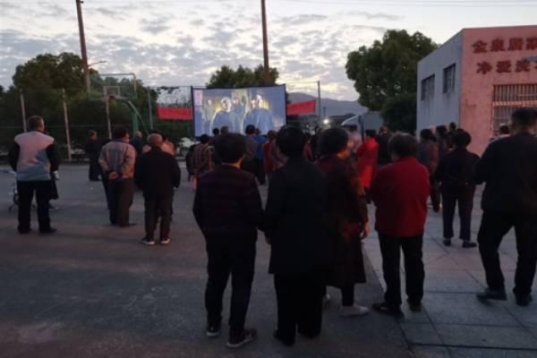 当晚的广场上汇聚着老老少少的居民、党员,看着荧幕闪烁着毛泽东同志建立党的农村基层组织,发动农民运动,探索中国革命发展道路的故事。满腔汹涌革命之火在燃烧,在各位观众的眼里那一段难忘的岁月是火红的。