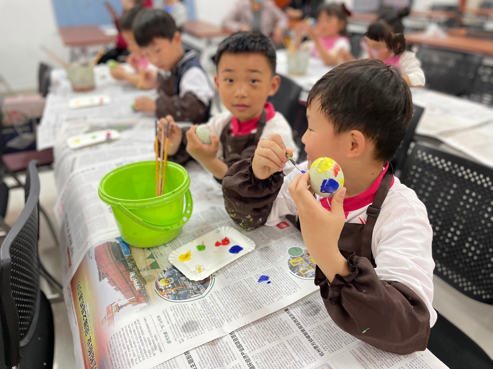 除此之外,为了让垃圾分类知识更为生动有趣,也为了更贴合“立夏”主题,社区邀请志愿者带领小朋友们绘制彩色鸭蛋。把各类垃圾以卡通图画的方式画在蛋壳上。