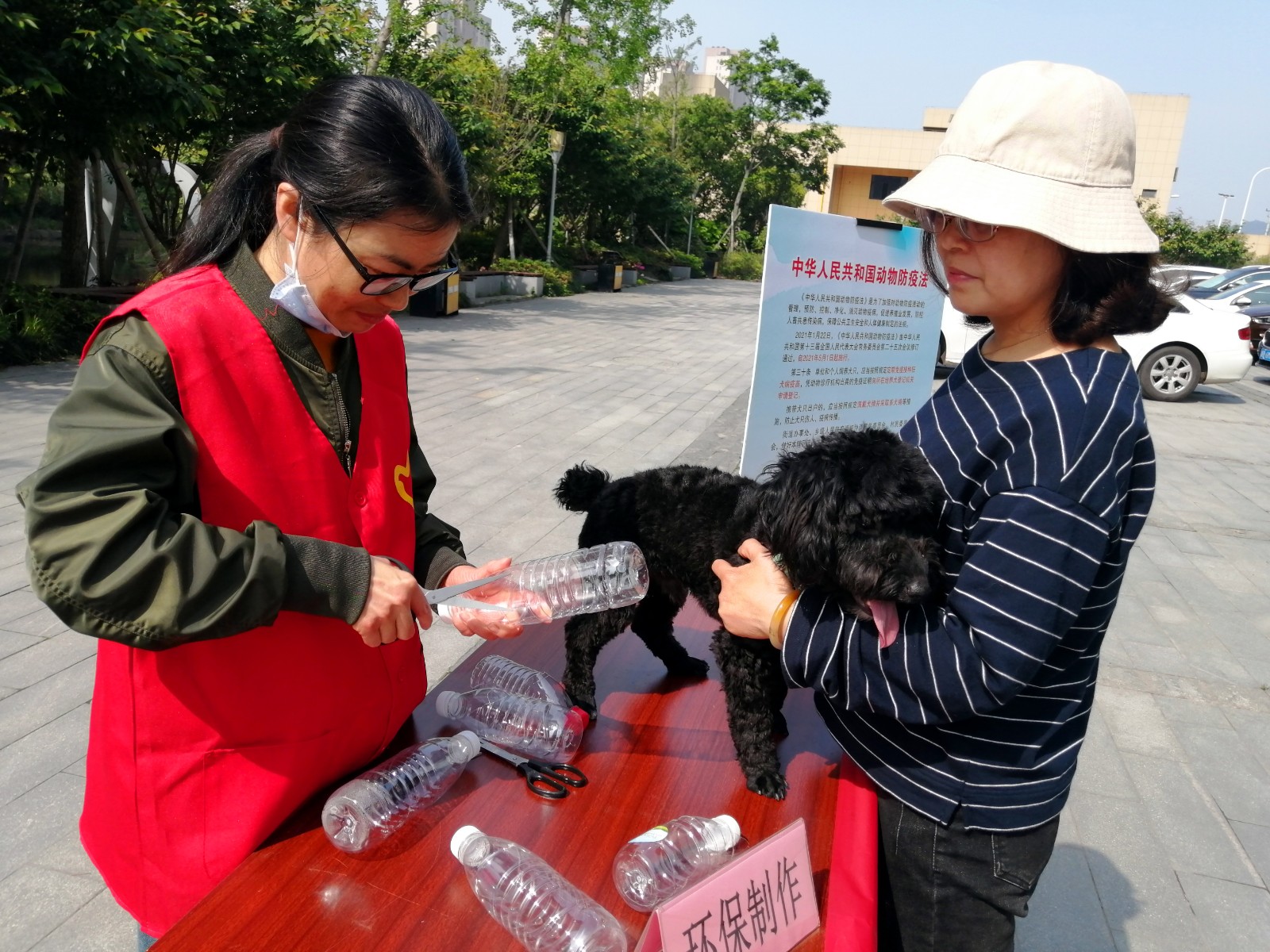 在“萌宠随行,文明相伴”宣传区域,辖区志愿者们和小港派出所民警们通过摆设宣传展板、发放宣传手册、现场答疑解惑等形式,向犬主宣传新修订的《中华人民共和国动物防疫法》相关政策。志愿者还现场教起了萌宠铲屎器的制作方法。