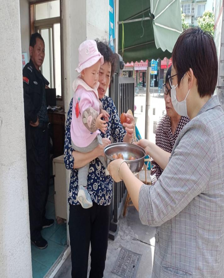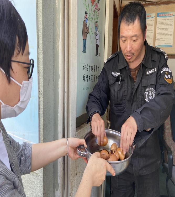 为了让社区里的环卫工人、保安、困难人群度过一个欢乐喜庆的立夏节,感谢他们为社区早出晚归的默默付出,社区工作人员带领志愿者、居民为他们送去了亲手煮制的爱心茶叶蛋。