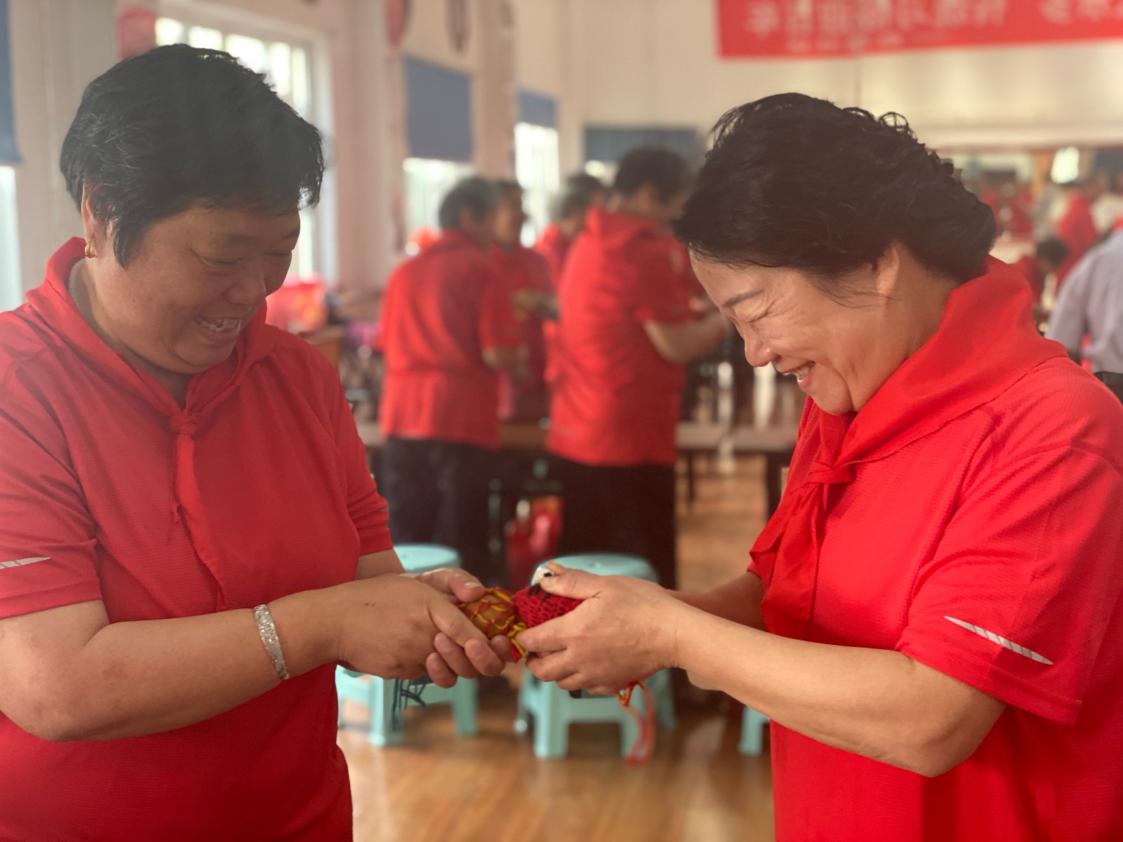 “盛夏初至,万物峥嵘。”在中国传统节气立夏来历之际,4月30日上午,俞范社区开展“立夏斗蛋欢乐好 传统习俗迎百年”活动。活动一开始,老年电大学员们头戴红领巾、手持小红旗在操场上站成100数字的队形,用手托起“不忘初心”四个字,共同唱响歌曲“不忘初心”,用音乐回顾党史,用歌声铭记初心,整齐的节奏、响亮的歌声都包含着大家内心对党和国家的赤诚之心。合唱结束后,阿姨们用事先从家里拿来各色彩线,相聚在一起编织 “立夏蛋”网袋。“网眼要编的小点,不然鸡蛋就会从网袋里漏出来。对了,这样大小正好,打个结就好了。”阿姨们互相交流着,一只只巧手翻飞,不知不觉,一个个色彩缤纷的蛋套就呈现在大家面前。接着“老小孩们”三五成群“斗蛋”,大家拿着煮熟的鸡蛋,两两对决,试探性地碰撞、缩回、再碰撞,玩得不亦乐乎。
