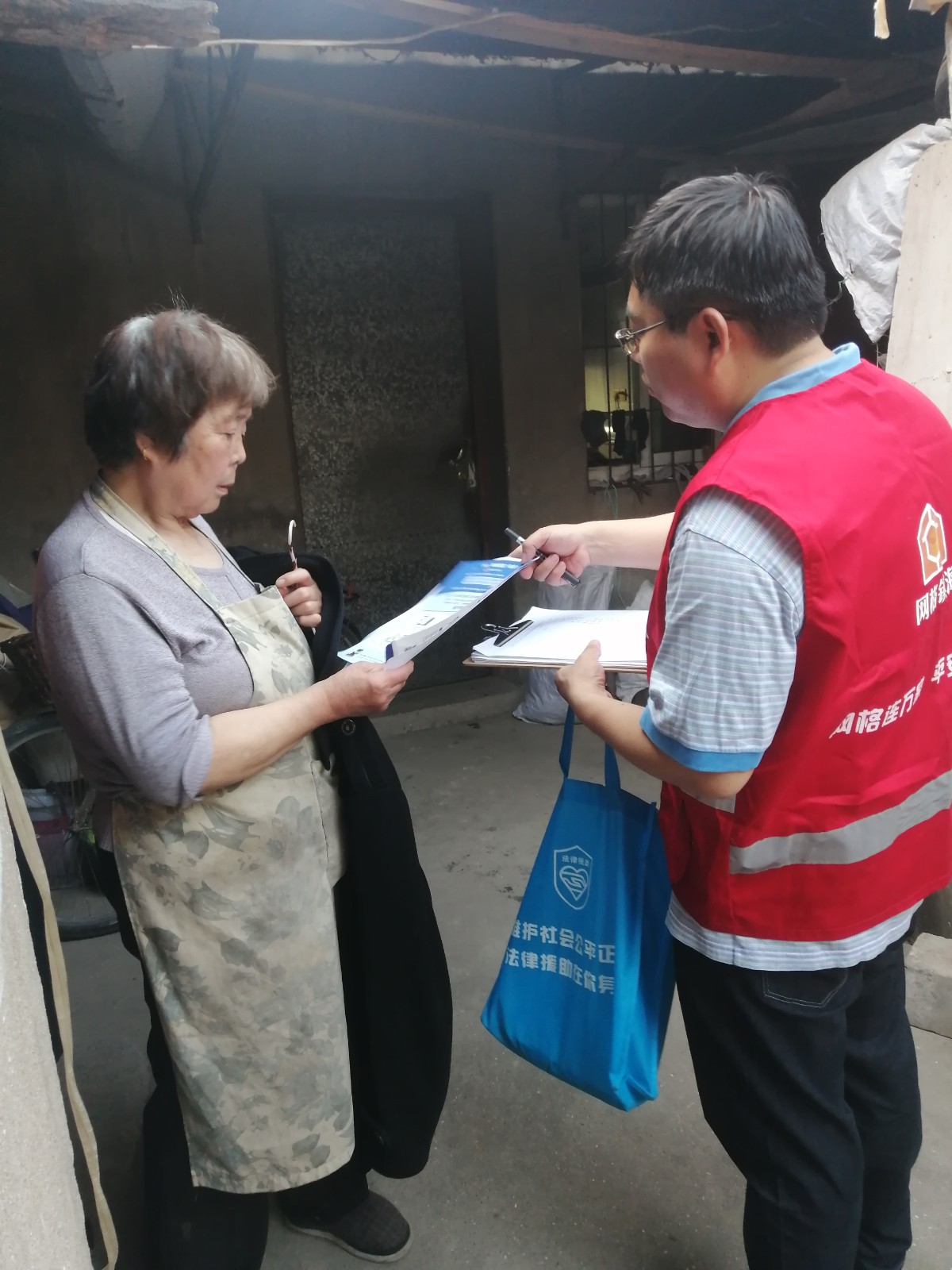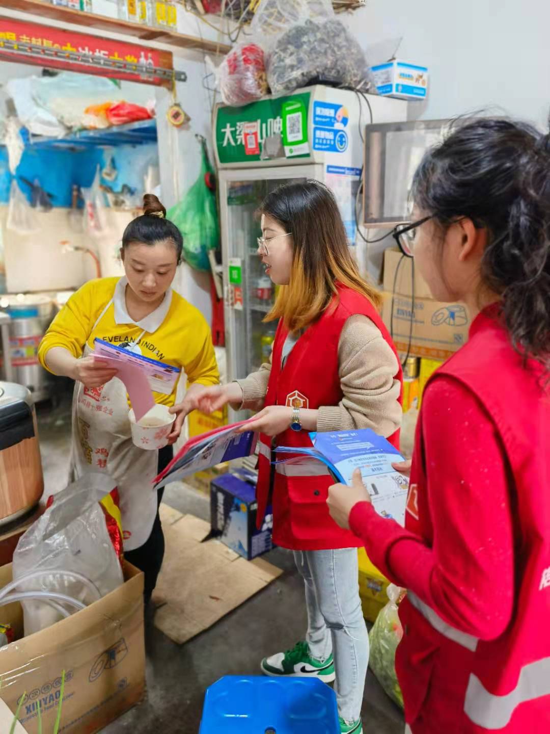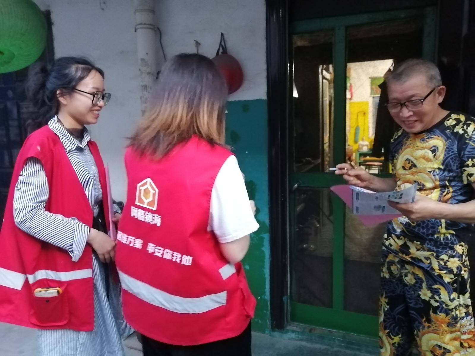 网格员们身穿红马甲,对网格内的中小企业、沿街店铺开展“地毯式”宣传排查,向企业负责人、员工(特别是财务人员)宣传电信网络诈骗案件特点。