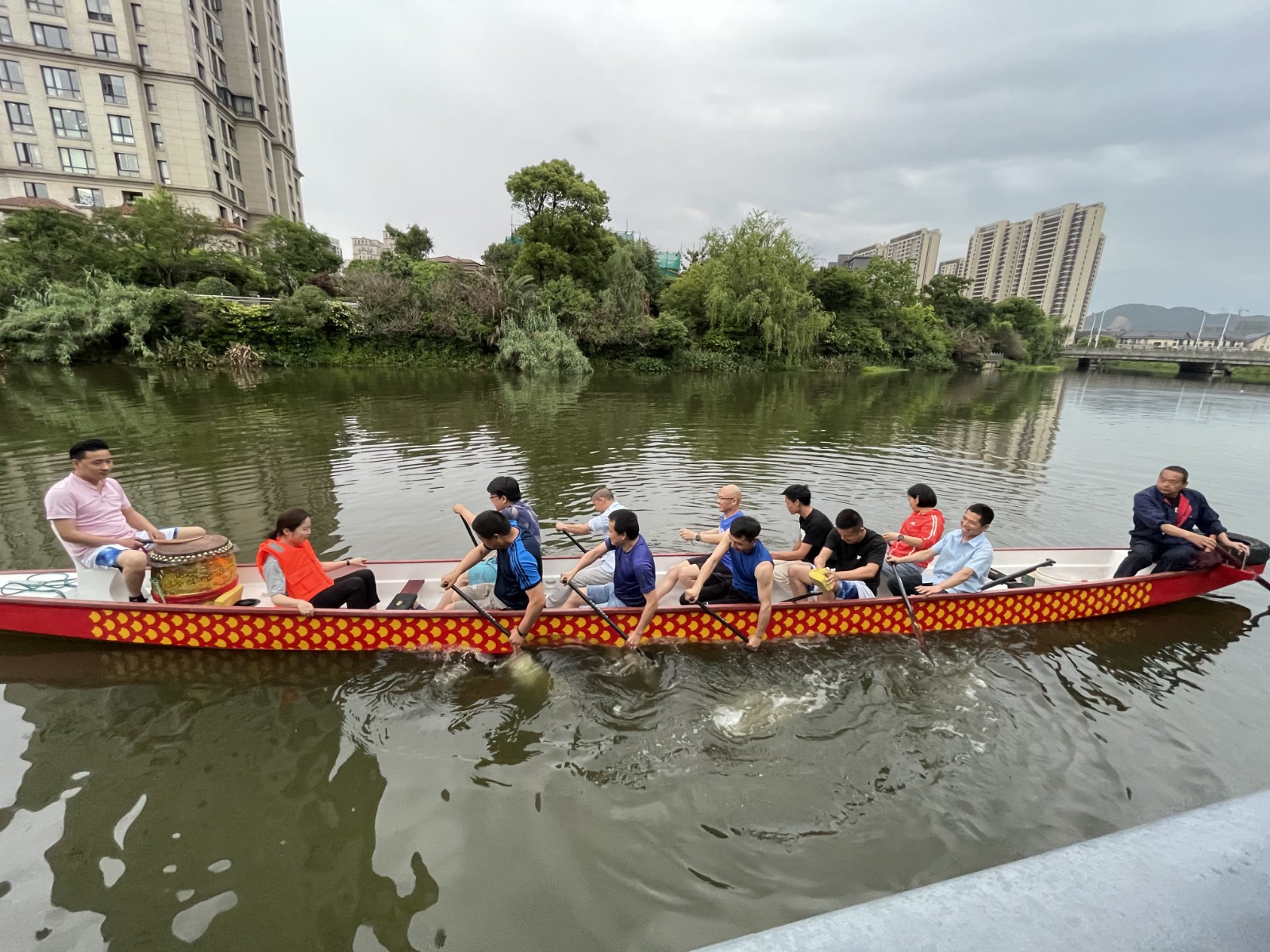 “咚…咚…咚…咚…”小浃江上不时的传来阵阵敲鼓声,只见一只红色的龙舟在水面上来回飞驰,竺山社区党总支书记乐琳琳坐龙舟船头鼓舞士气,参赛队员们伴随着规律的鼓点节奏,弯腰,插桨,挥臂,划桨,提桨,齐齐发力。训练吸引了周边群众驻足观看,大家提前感受到了划龙舟的快乐。